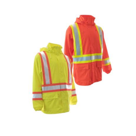 Water-resistant (up to 8000mm) and windproof hi-vis safety rain jacket is made of a lightweight polyurethane shell. This allows the user to stay warm and dry while feeling like they are wearing as little as a summer nylon anorak. Did we mention it is fire-resistant, in accordance with the CGSB Type 3 standard. Whether you are working on steamship lines or construction sites, this is the best choice for a waterproof rain jacket that meets CGSB fire resistance and CSA hi-vis standards.