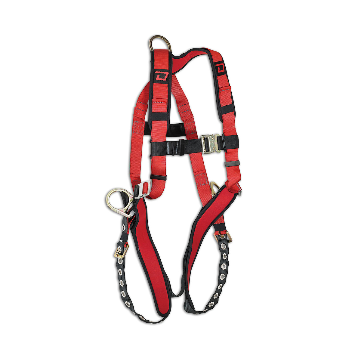 The “DYNA-PRO” line of harnesses were designed for the ultimate in ease of harness donning, with light weight breathable padding only where it is required. The “DYNA-PRO” has minimal body contact for a superior fit and comfort. Most presently available padded harnesses have padding in areas that do not add to the users comfort, in fact they actually create unnecessary hot zones. When wearing this harness the user forgets that they are wearing it even if they wear it all day long. The “DYNA-PRO” harness is the lightest in its category. It offers all the necessary cushion padding needed for maximum comfort and in no case does the padding interfere with the mobility necessary to do the job. The harness also has trauma straps on both sides to provide time in a rescue situation.