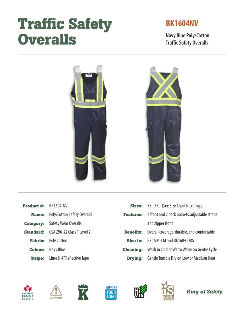 Standard: Navy – CSA Z96-22 Class 1 Level 2, Orange & Yellow – CSA Z96-22 Class 2 Level 2