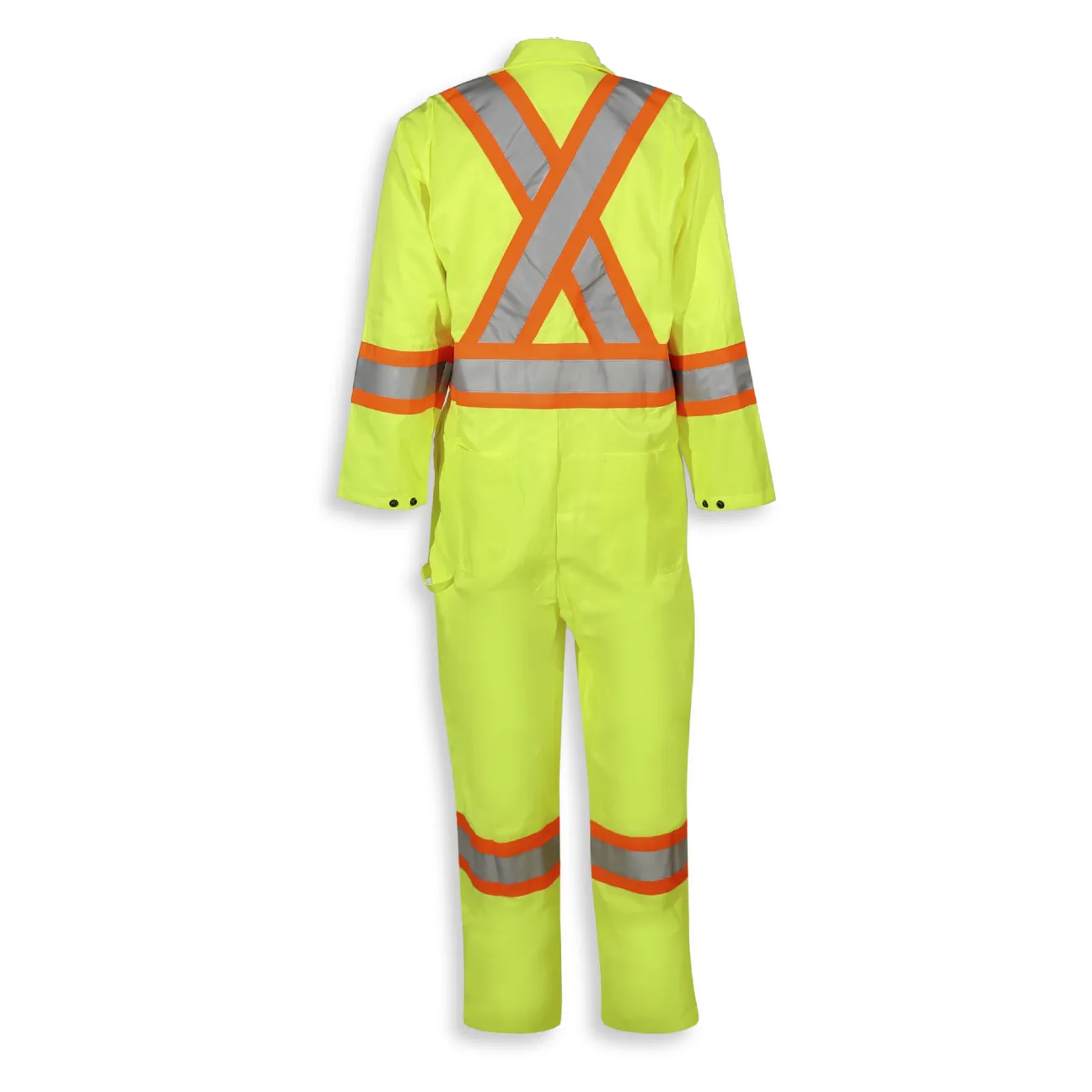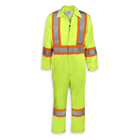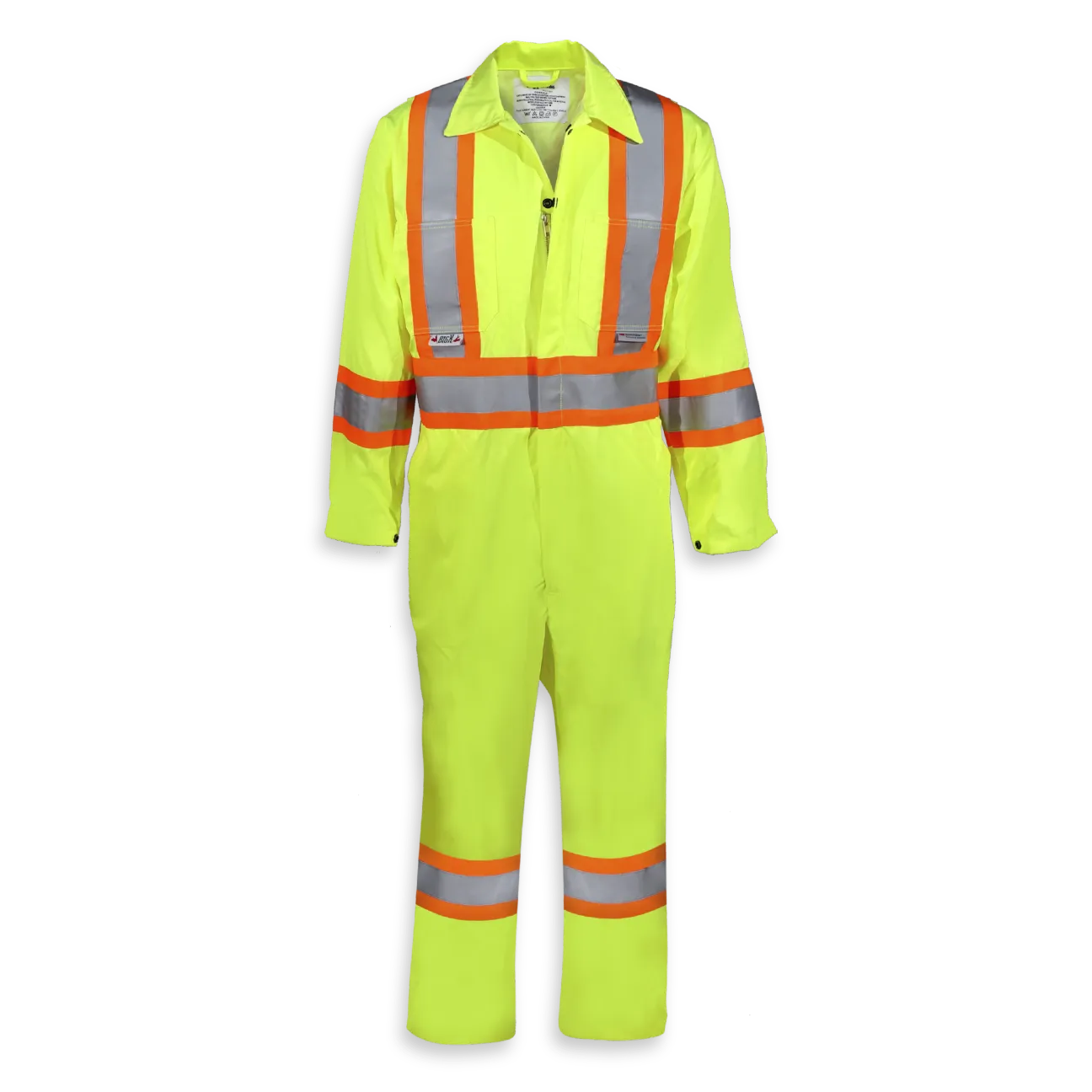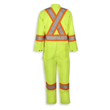 These lime green hi-vis poly/cotton coveralls feature 4 front pockets, a pocket on the left arm and 4” 3m #9920 industrial washable reflective tape.