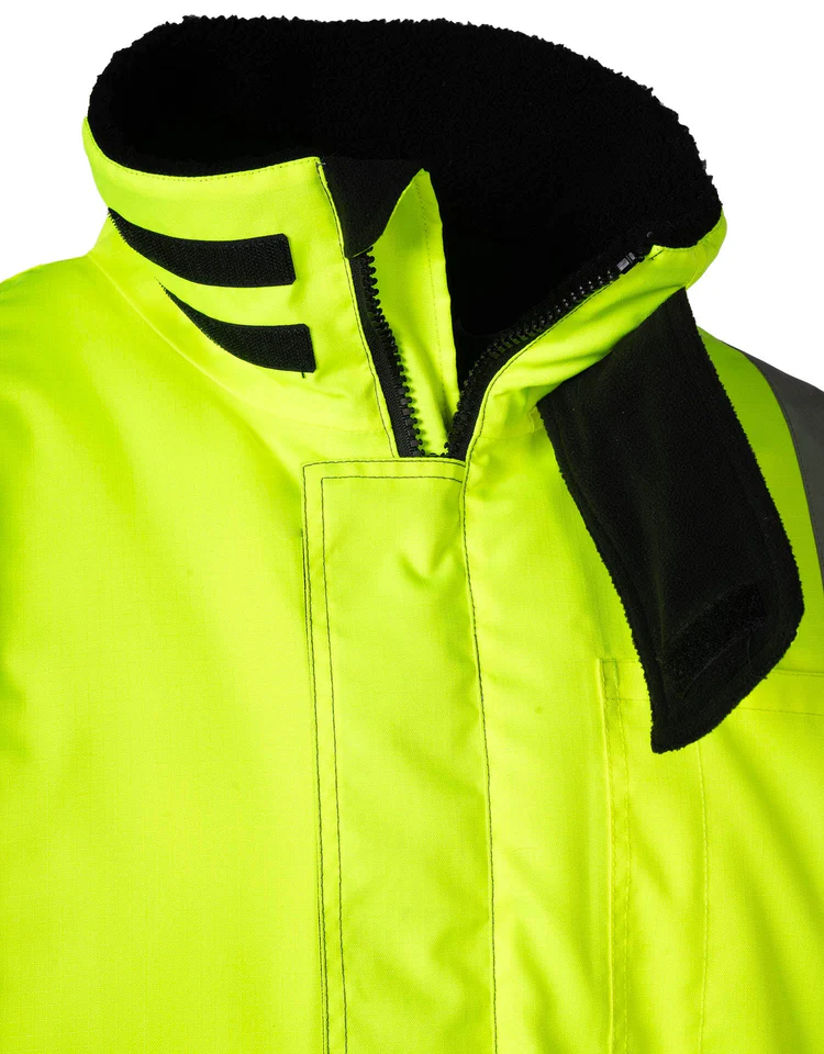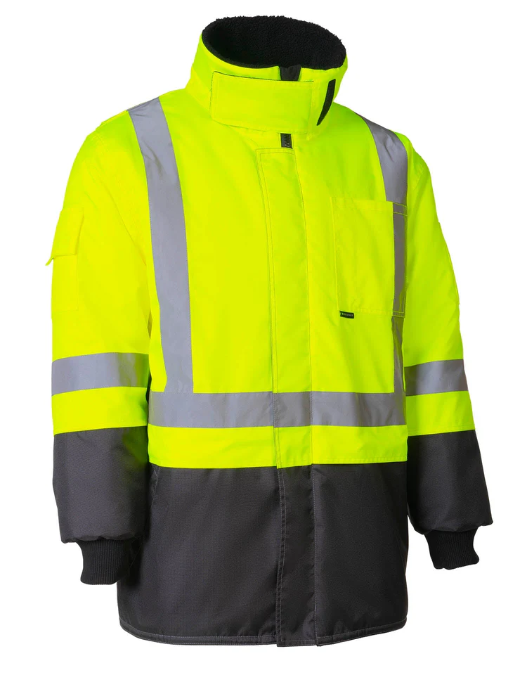 Experience the ultimate in cold-weather protection with the Fraser Freezer Jacket, named after the frigid Fraser, British Columbia. Engineered to withstand temperatures down to -47.9°C, this jacket features a high-cut, fully lined collar, and a snap-back option for adaptable comfort. Its Forcefield Zip Extensions allow easy access to gear with gloves on. Made from 100% 300D Oxford Poly Ripstop, it ensures durability and tear resistance. The jacket offers ample storage with multiple pockets, including a secured sleeve pocket for essential IDs and certificates. The customized glove sleeve enhances warmth in extreme cold, while the heavy-duty yet lightweight lining provides insulation without bulk. Ideal for cold storage, food service, transportation, and demanding environments, it fully complies with the latest CSA standard: CSA Z96-22; Lime meets Class 2 Level 2.