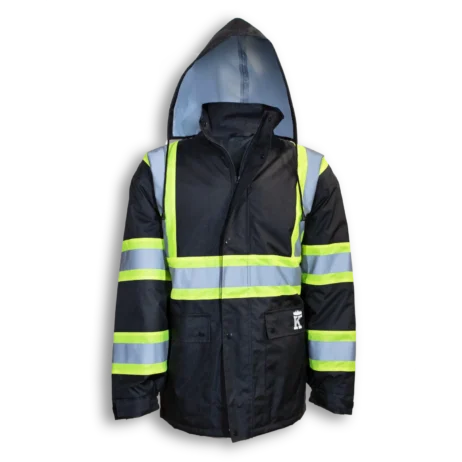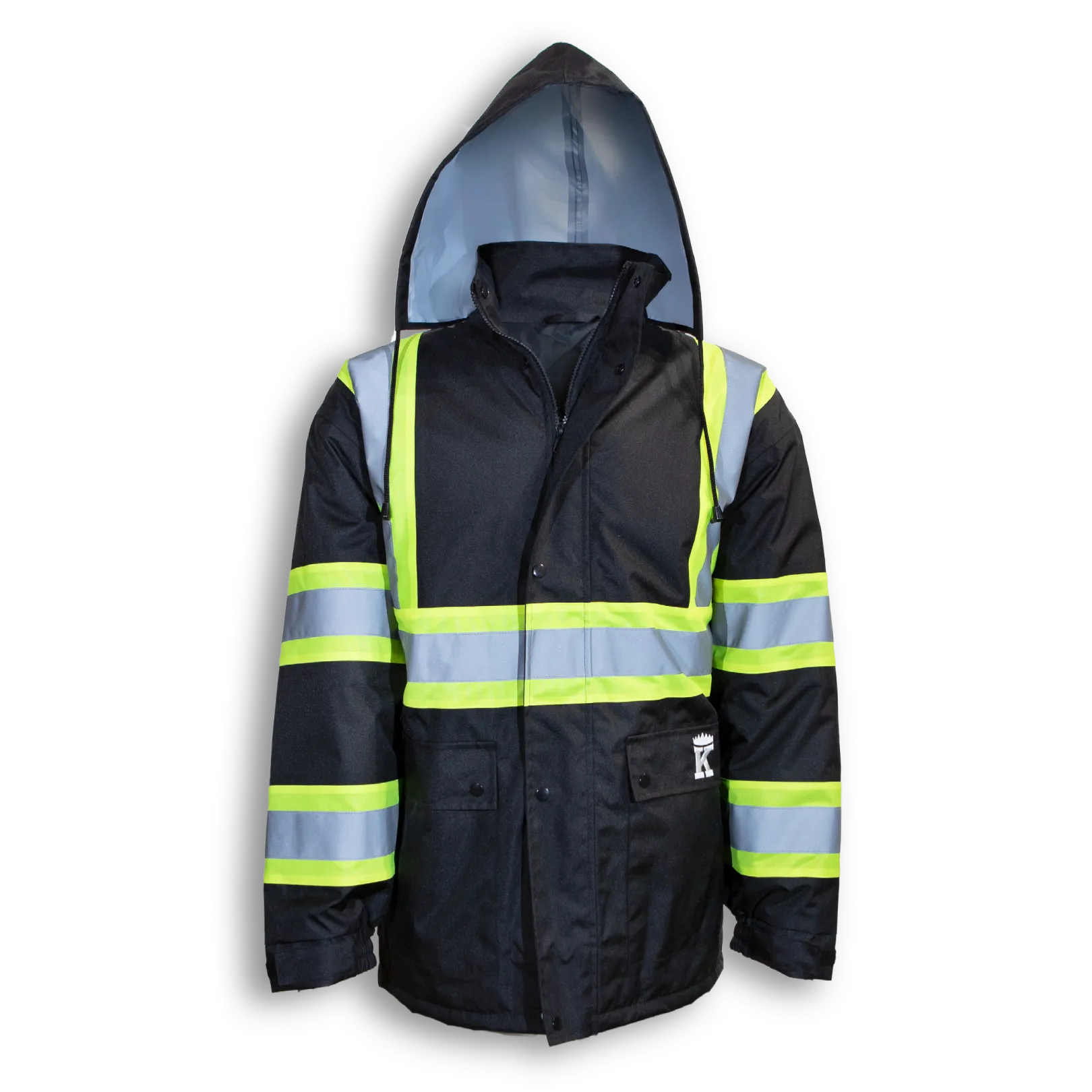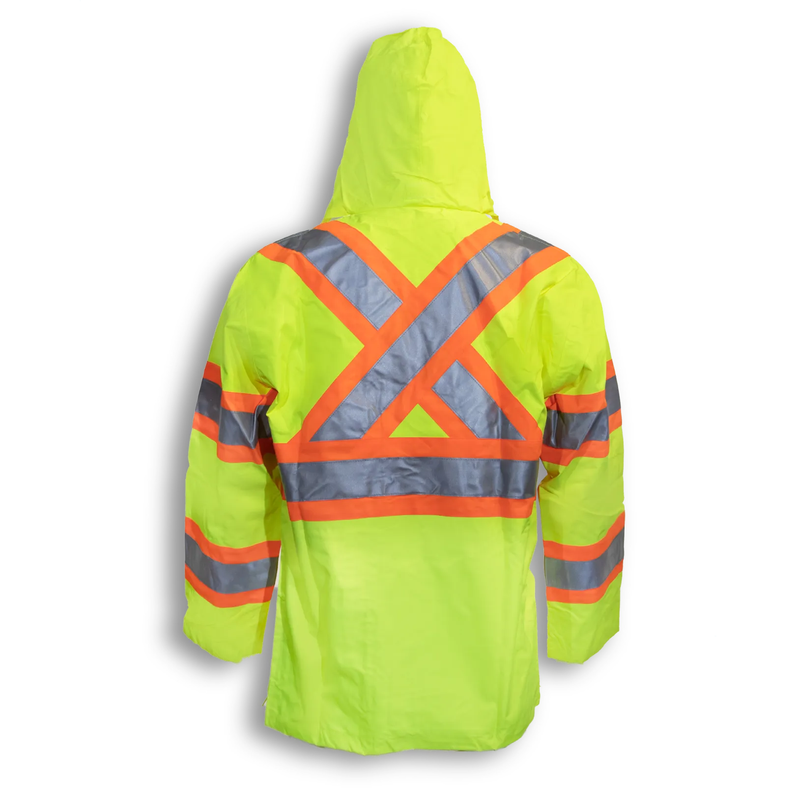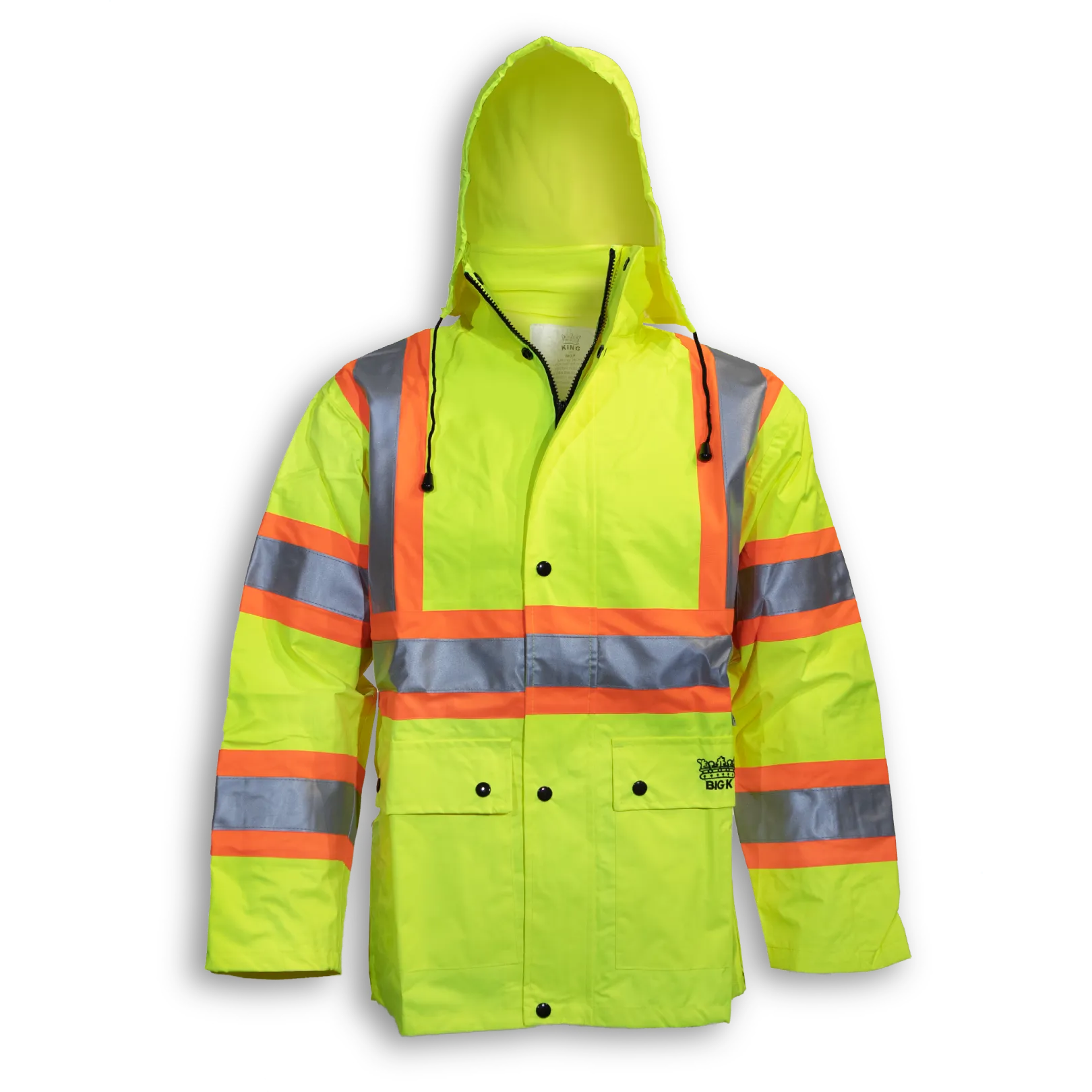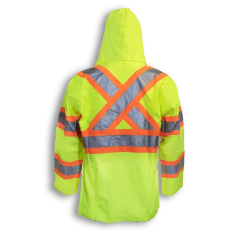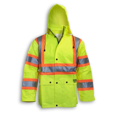 This waterproof and breathable, lime green 300 Denier polyester rain jacket has 2 bottom pockets, a 6” zipper on each side, a hide-away hood and 4” 3M reflective tape.