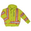 This hi-vis bomber is made from durable waterproof breathable Ripstop material. It features a quick release hood as well as adjustable cuffs to keep out the elements. It makes a great embellishment piece.