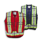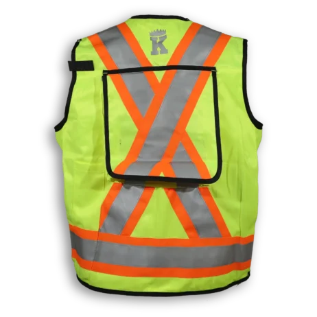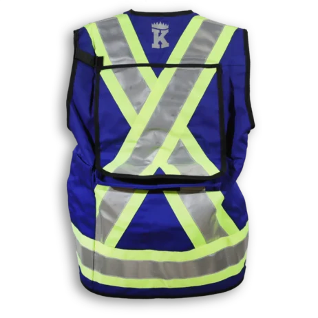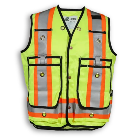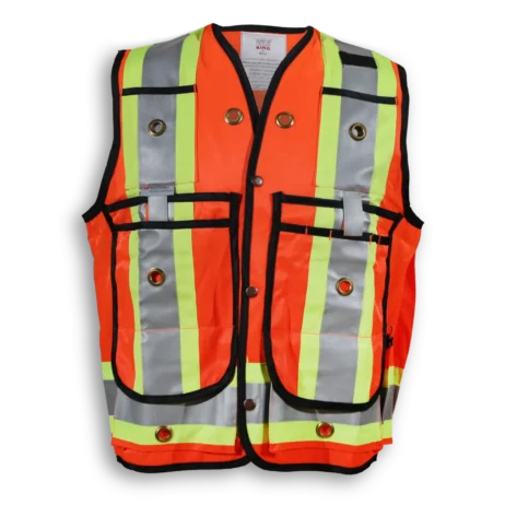 Surveyor vest c/w 8 front pockets, 4 inside pockets and radio pocket. Vest has double back pouch and 4″ 3M reflective tape.
