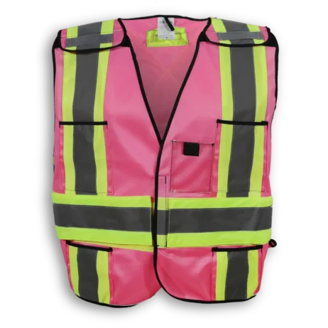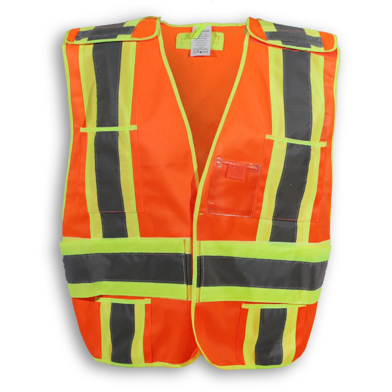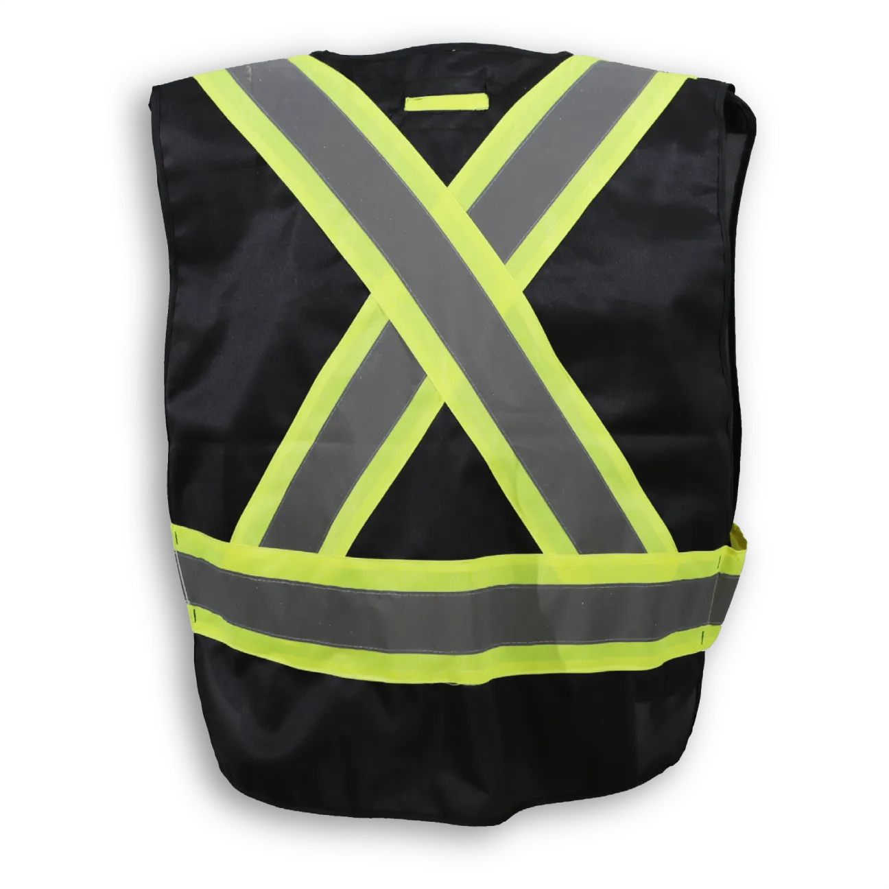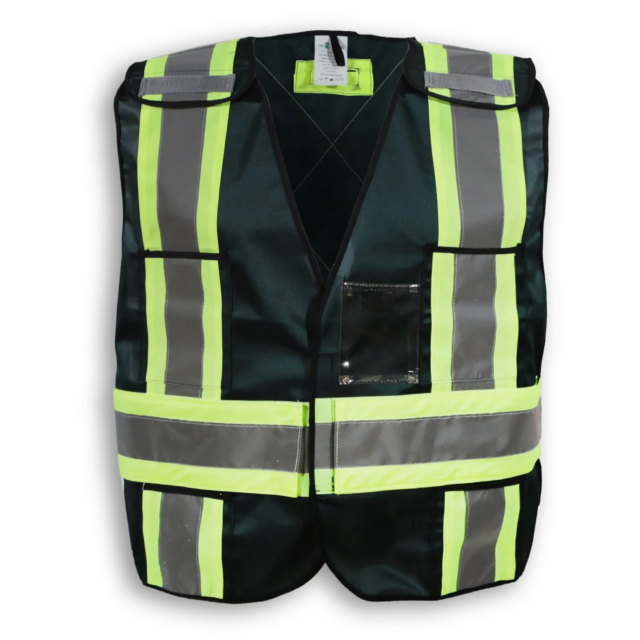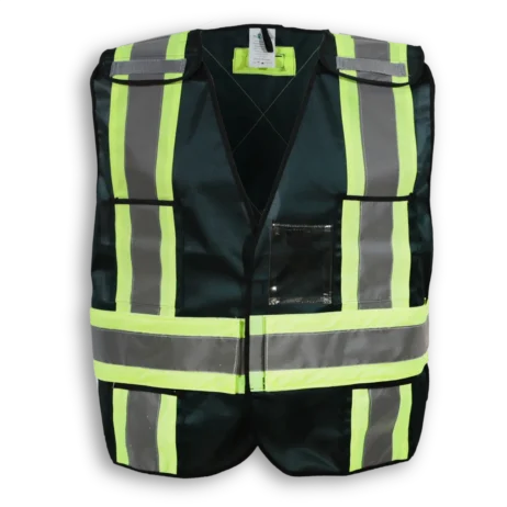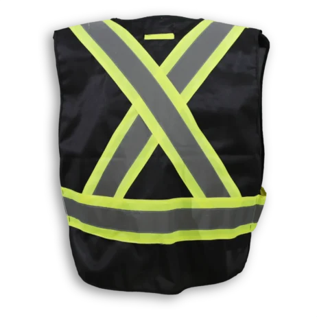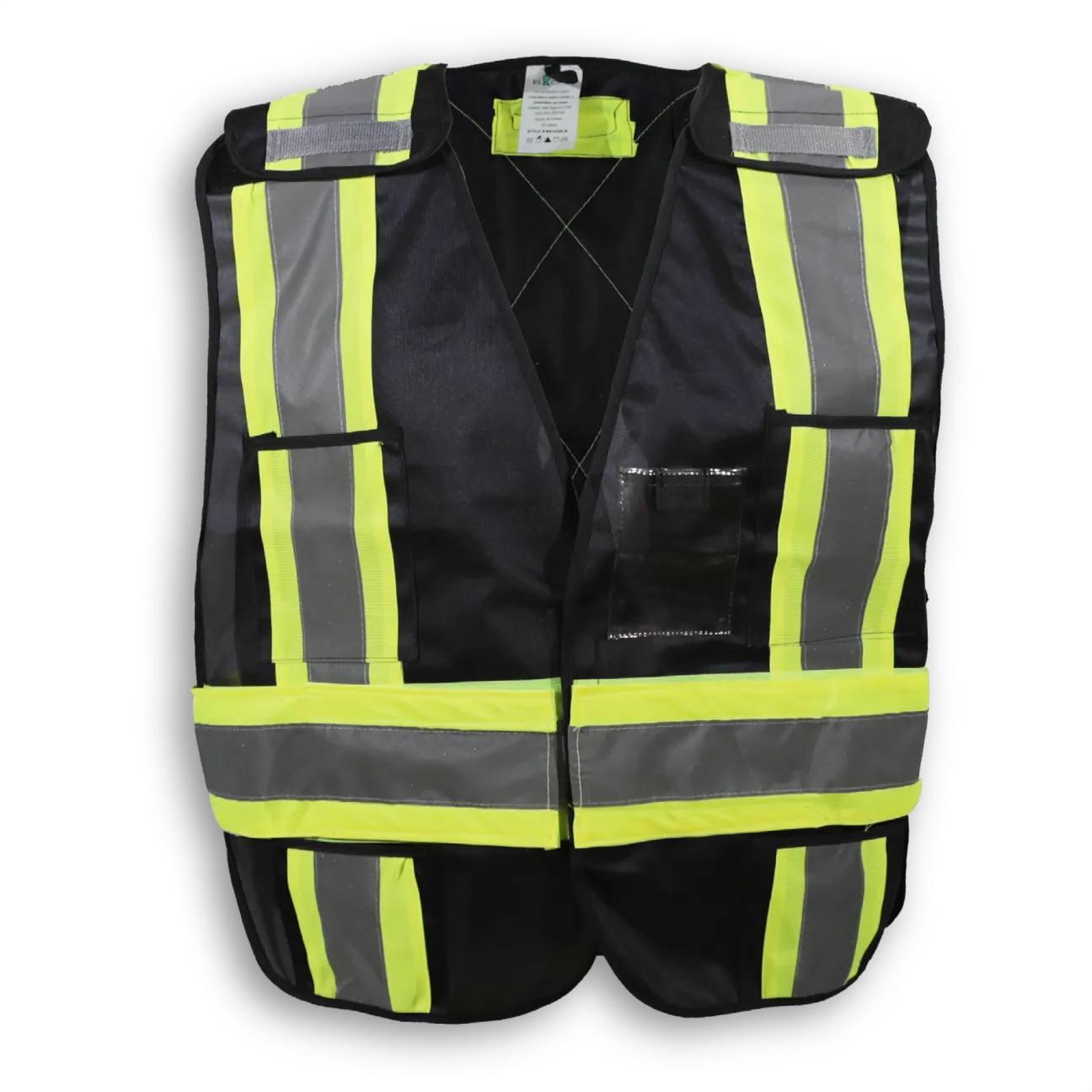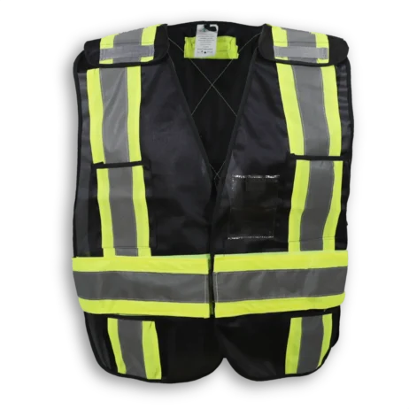 Featuring a convenient D-ring slot, this 100% polyester black safety vest has a 5-point tear-away system, 4 front pockets, a clear ID pocket and 4” reflective tape.