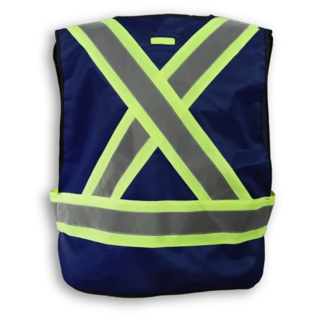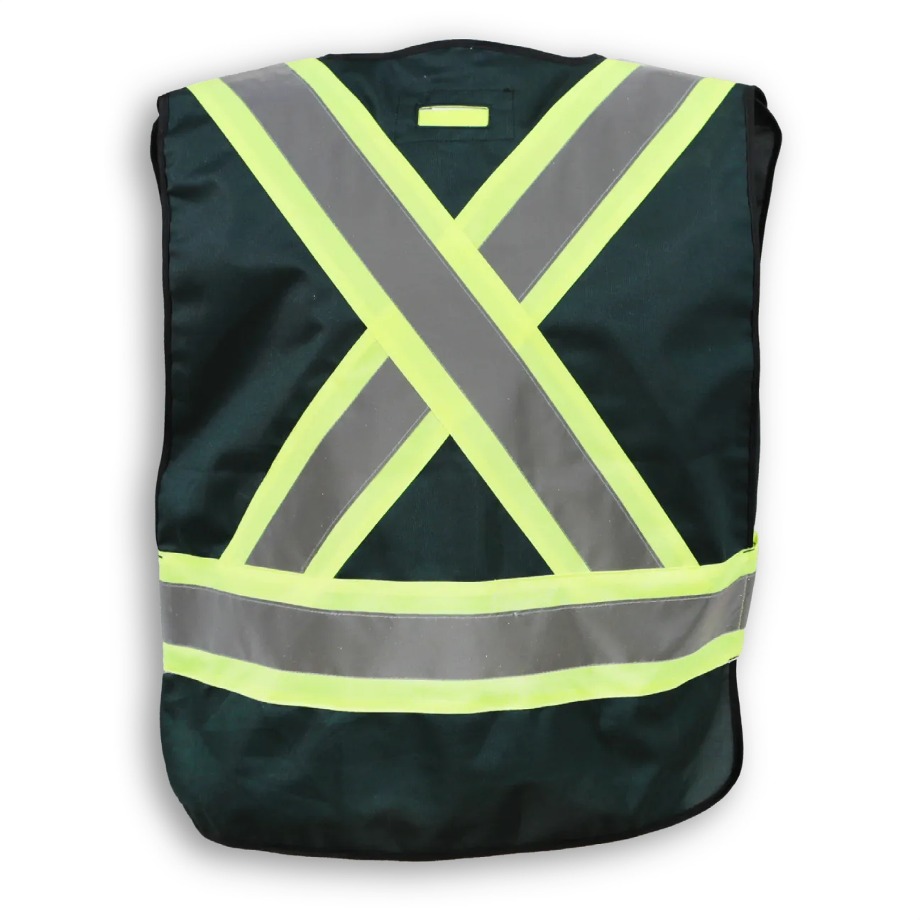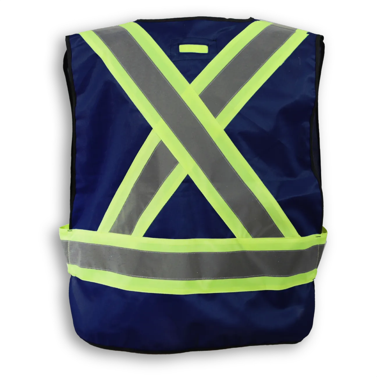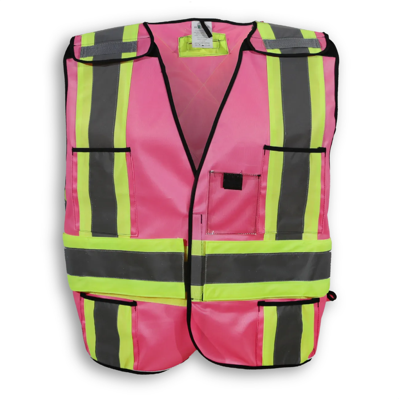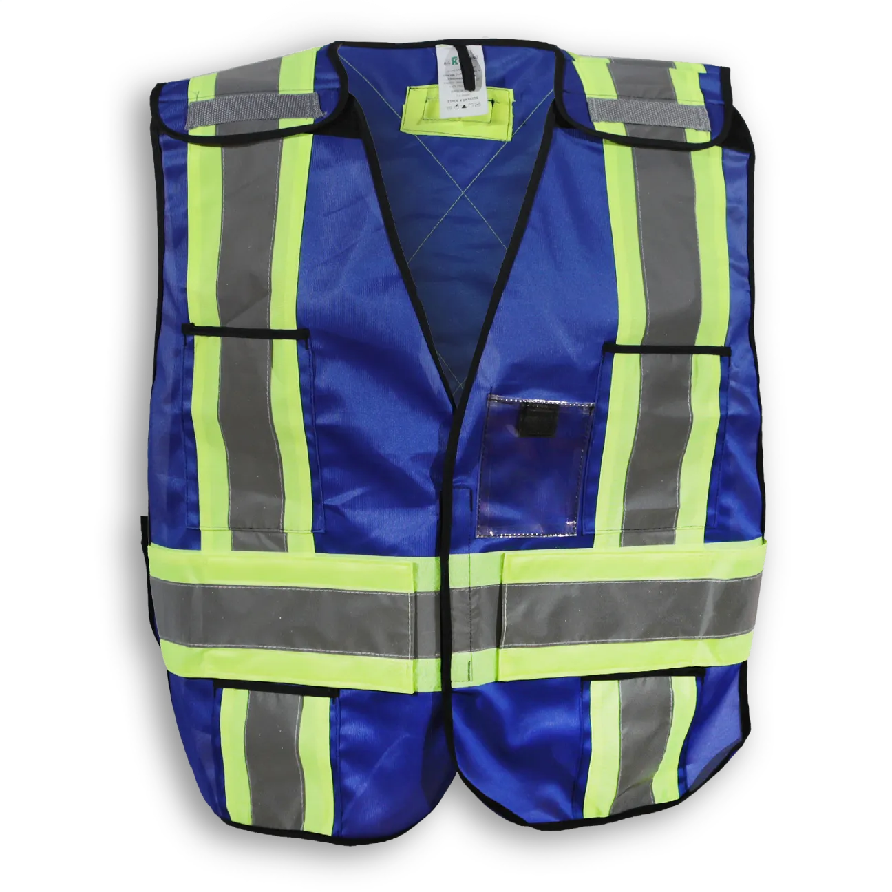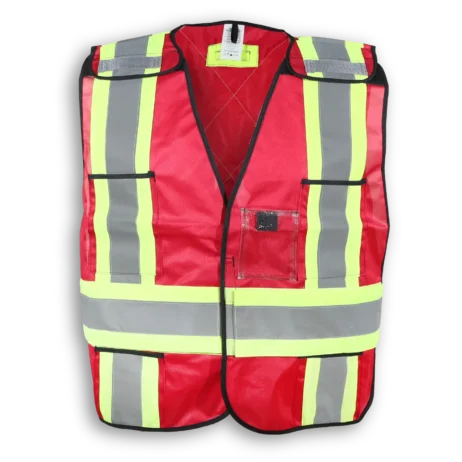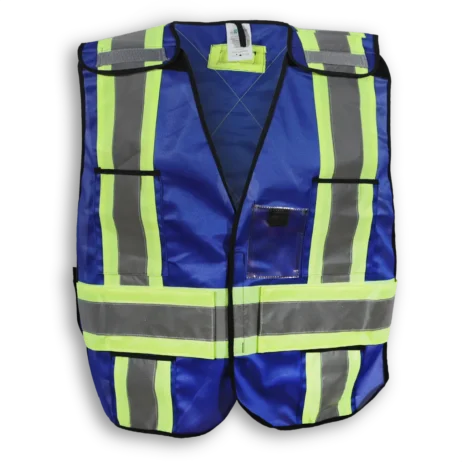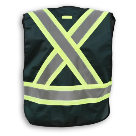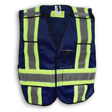 Featuring a convenient D-ring slot, this 100% polyester black safety vest has a 5-point tear-away system, 4 front pockets, a clear ID pocket and 4” reflective tape.